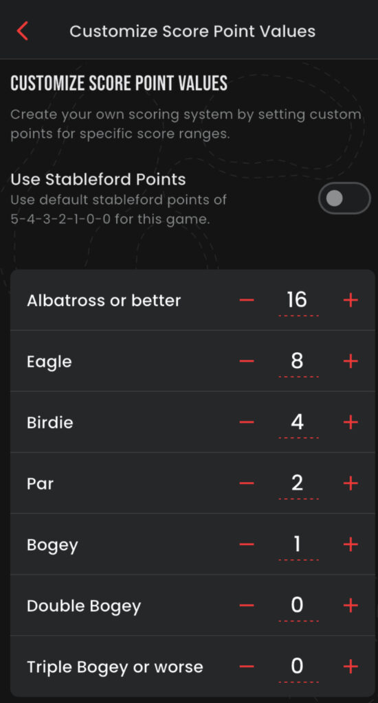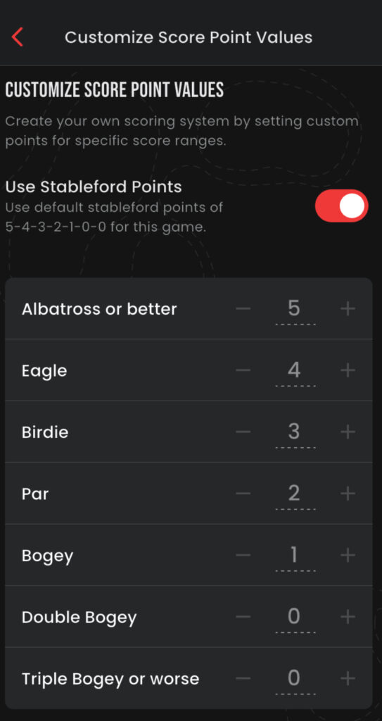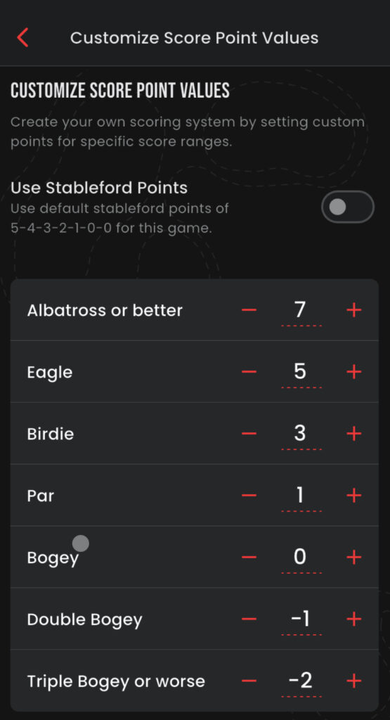 Points Game. Standard, Stableford or custom points setting… no matter how you play it… we have your group covered. This game is designed to let all skill levels complete on an even playing field. Can be played in same pairing or across multiple pairings and multi in multi day events/golf trips.